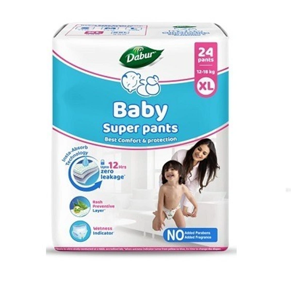 Dabur Baby Super Pants - XL (24 Pieces) | 12-18 kg | Insta-Absorb Technology | Diapers Infused with Aloe Vera, Shea Butter & Vitamin E | No Added Parabens, Added Fragrances